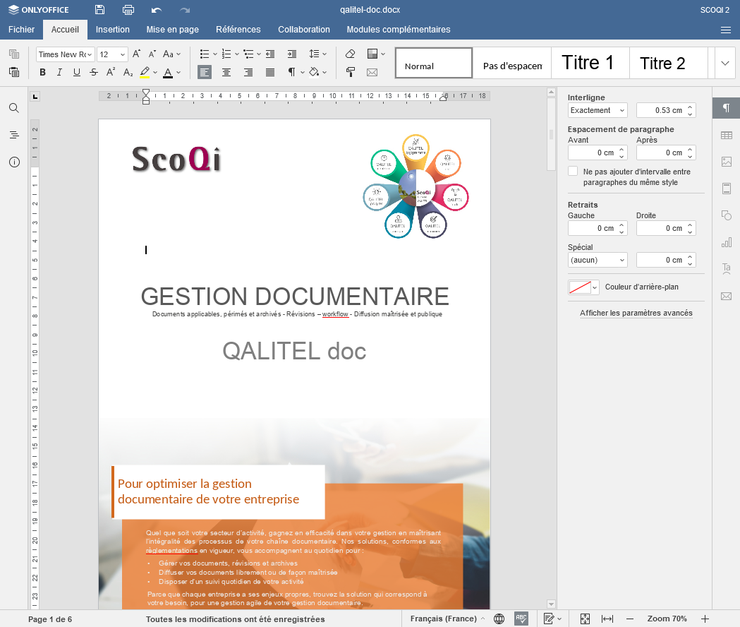 Editeur intégré ! QALITEL doc, dans ses versions Pro et Premium embarquele fameux éditeur de documents en ligne Onlyoffice et qui se dénomme pour des raisons d'intégration SCOQI…